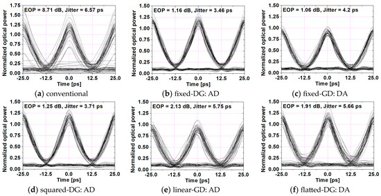 Applying this mechanism to the eye diagram analysis shown in Figure 3, the eye diagram of Figure 3a shows that the conventional dispersion map does not sufficiently compensate for the amplitude and phase distortion caused by the interaction between the chromatic dispersion and SPM experienced by the optical pulse. On the other hand, although there are differences in degree, it can be confirmed that the proposed dispersion maps combined with midway-OPC help reduce the amplitude and phase fluctuation of the optical signal.