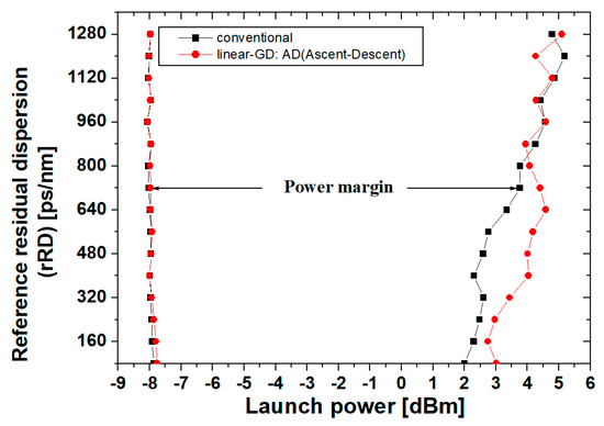 Figure 4 shows the rRD of the fiber span against the WDM channel launch power that can achieve 1 dB EOP for the worst channel, when WDM channels are transmitted through a dispersion-managed link configured with conventional dispersion map and with ‘linear-GD: AD’ of Figure 2f. It should be noted from Figure 4 that there is a lower limit on the launch power of the WDM channel that can achieve 1 dB EOP. It is judged that this is because when the launch power of the WDM channel is very small, the loss of the optical fiber can greatly affect the channel signals, and as a result, the compensation effect by the midway-OPC is reduced. What can be utilized from the results of Figure 4 is that the allowable range of the channel’s launch power for each rRD must be limited to achieve an EOP of 1 dB or less through the dispersion-managed link configured with the dispersion map of Figure 2. We define this range as the power margin notated in Figure 4. That is, the power margin is the difference between the maximum and the minimum value of the launch power of the WDM channel that can obtain 1-dB EOP.