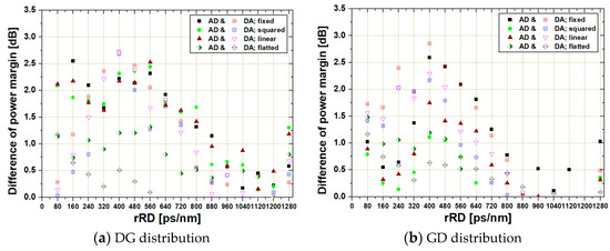 Optimization of the dispersion map is important not only in the distribution of cumulative dispersion in the entire link, but also in the magnitude of the residual dispersion per span. Figure 5 makes it possible to evaluate the effect of the magnitude of rRD on compensation in the proposed dispersion map in terms of power margin. Figure 5 shows the difference in power margin of the worst channel as a function of the rRD in the dispersion-managed link to each of the 16 different dispersion maps. The power margin difference is the arithmetic subtraction of the power margin obtained when the conventional dispersion map is applied from the power margin obtained when each dispersion map is applied into a dispersion-managed link. In other words, Figure 5 shows how much the power margin in the proposed dispersion maps is improved compared to the conventional dispersion map. As each value shown in Figure 5 increases, the compensation effect can be considered to have increased further. A feature common to Figure 5a,b is that the compensation effect is better improved when the rRD of each fiber span selected for each dispersion map in Figure 2 is moderately small (i.e., around 400 ps/nm). And from the rRD point of view, the dispersion maps that can achieve the improved compensation effect for all considered rRDs over the conventional configuration, albeit to varying degrees, are the fixed configurations of Figure 2a,b.
