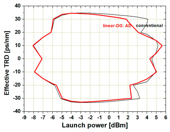 Although the compensation characteristics for each dispersion map are examined when the TRD of the dispersion-managed link is basically set to 10 ps/nm, the EOP of 1-dB or less can be also obtained at other TRDs. Figure 6 shows the range of TRDs that result in 1-dB EOP at each launch power of the worst channel, which is the example of the above-mentioned feature. In Figure 6, the effective TRD means the upper and lower limits of the TRD that can obtain 1-dB EOP for each launch power. Although the characteristics of launch power versus effective TRD obtained from the conventional dispersion map and the dispersion map of the linear-DG:AD are generally similar, there is a distinguishable difference when the launch power is large.