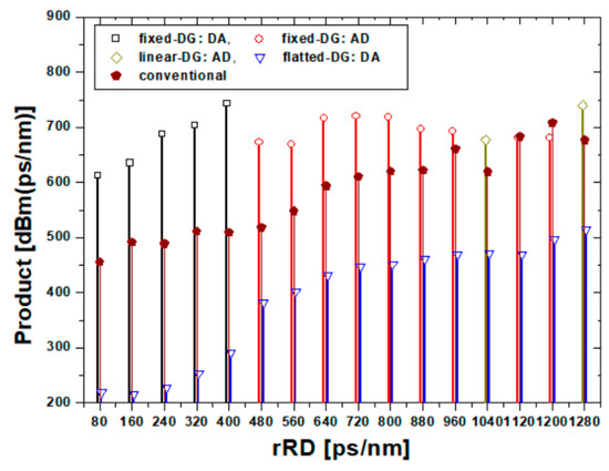 Through analyzing the results of Figure 7, it can be judged that the linear-DG: AD is the excellent dispersion map at rRD = 1280 ps/nm, but it cannot be recognized as the effective dispersion map that satisfies the purpose of this paper, since there is no significant difference from the product in the conventional dispersion map designed with the same rRD. Analyzing from the viewpoint of improving the product characteristics compared to the conventional dispersion map, it can be confirmed that the degree of improvement increases as the rRD applied to the dispersion map increases to 400 ps/nm, but decreases when the rRD exceeds 400 ps/nm. An interesting result from Figure 7 is that the dispersion map configuration that can lead to the good product is different for each rRD, but the dispersion map results in the minimum product for all rRDs is only flatted-DG: DA of Figure 2g. This result suggests that the maximum cumulative dispersion of the link must be variable, not constant, regardless of the detailed scheme of the dispersion map, in order to effectively compensate for the distorted WDM channels.