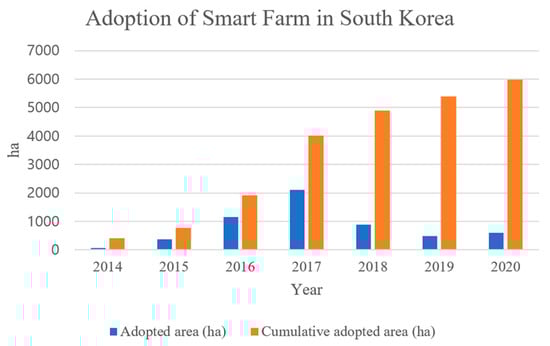 According to the MAFRA (Ministry of Agriculture, Food and Rural Affairs Korea), the country’s smart agriculture market is projected to grow from USD 240 million in 2020 to USD 490 million over a span of 25 years, with a compound annual growth rate of 15.5% [11]. Furthermore, Figure 1 illustrates the Smart Farm Adoption Status in South Korea, revealing a notable trend of continuous expansion in the smart farming sector. The area dedicated to smart farms has experienced significant growth over the years, increasing from 405 hectares in 2014 to an impressive 5383 hectares by the year 2020.