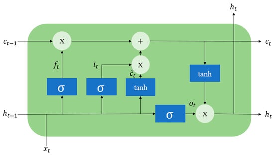 Long Short-Term Memory (LSTM) is a model introduced in 1997 as a type of Recurrent Neural Network (RNN) that addresses the long-term dependency problem by incorporating a cell state structure [22,23]. The structure of LSTM cell is shown in Figure 2.