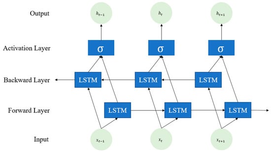 Since LSTM is a unidirectional model that relies solely on previous information to predict the current state, it has limitations in simultaneously processing both past and future information. To overcome this limitation, the Bidirectional-LSTM (BI-LSTM) model was proposed in 2005. BI-LSTM incorporates an additional LSTM that operates in the reverse direction during the forward learning process of LSTM [34,35]. The structure of BI-LSTM enables bidirectional information processing by sequentially processing input data from front to back through the Forward LSTM Layer and from back to front through the Backward LSTM Layer. The outputs of these layers are connected together with an activation function, facilitating the integration of bidirectional information processing, as shown in Figure 3 [36].
