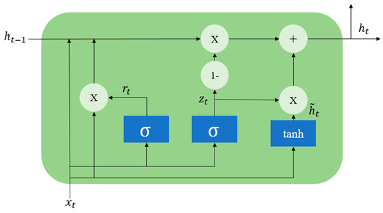 Gated Recurrent Unit (GRU) is a model introduced in 2014, belongs to the category of RNN, and is specifically designed to address the challenge of long-term dependencies encountered in LSTM. GRU exhibits a simpler structure compared to LSTM, incorporating only two gates: the update gate and the reset gate, as shown in Figure 4 [37,38].
