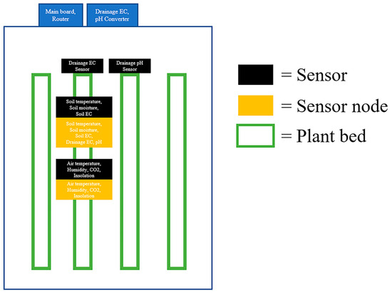The primary crops cultivated in the Jeonbuk region of South Korea include paprika, tomatoes, and strawberries. The Fruit and Vegetable Research Institute at Jeonbuk Agricultural Research & Extension Services generously offered us access to their paprika greenhouse, consequently leading to the selection of paprika as the focal crop for our study. The paprika testbed was established to collect environmental data for smart farm. It was equipped with a main board, sensor board, router, converter, and sensors. The structure of the established paprika testbed is depicted in Figure 5.