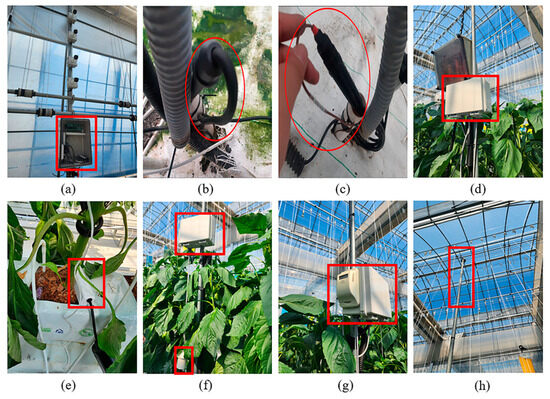 Testbed for Smart Farm ((a): Main board and Router, (b): Drainage EC Sensor, (c): Drainage pH Sensor, (d): Soil temperature, moisture, EC, Drainage EC, pH Sensor node, (e): Soil temperature, moisture, EC Sensor, (f): Air temperature, Humidity, CO2, Insolation Sensor node and Air temperature, Humidity Sensor, (g): CO2 Sensor, (h): Insolation Sensor).