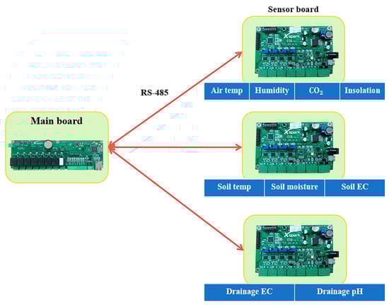 Figure 7 illustrates the process of acquiring environmental sensor data, which operates through RS-485 communication between the main board and the three sensor boards for data transmission and reception. The first sensor board is responsible for acquiring four types of data: air temperature, humidity, CO2, and insolation. The second sensor board is dedicated to acquiring three types of data: soil temperature, soil moisture, and soil EC. Lastly, the third sensor board is responsible for acquiring two types of data: drainage EC and drainage pH.