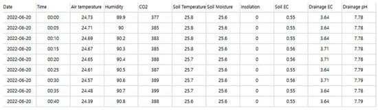 We collected environmental sensor data at 5-min intervals from 20 June to 20 September. The stored data was extracted from the database and imported to Excel sheets for data preprocessing. After excluding any missing data, approximately 220,000 data points were obtained. The part of the preprocessed data is shown in Figure 9.