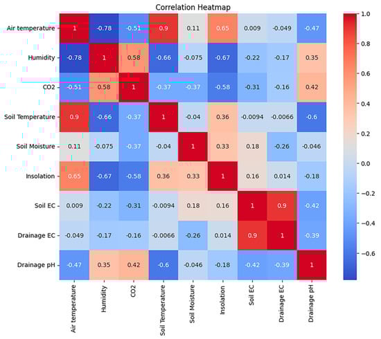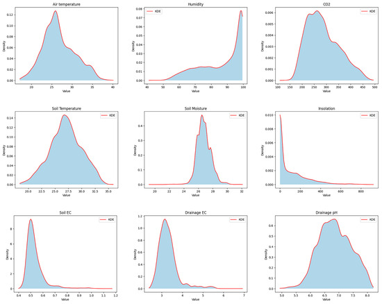 Figure 11 shows a Gaussian KDE of the environmental sensor data, comprising air temperature, humidity, CO2, soil temperature, soil moisture, insolation, soil EC, drainage EC, and drainage pH arranged from the top left. During the data distribution analysis, specific patterns were observed in the environmental variables. Air temperature data displayed a notable concentration of around 25 °C, while humidity exhibited a high distribution within the range of 90% and 100%. CO2 concentrations demonstrated a significant presence between 200 and 300 ppm, and soil temperature displayed a high distribution between 25 °C and 27.5 °C. Soil moisture levels ranged from 26% to 28%, while insolation varied from 0 to 100 w/. Additionally, both soil EC and drainage EC showed prominent distributions centered around 0.5 dS/m and 3 dS/m, respectively. Lastly, drainage pH exhibited a high distribution between 6.5 and 7.0 pH.