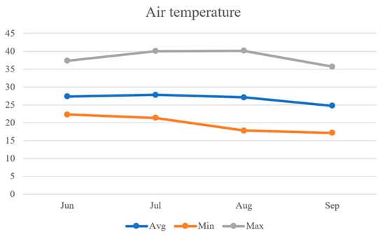 As can be seen in Figure 12, the average air temperature values were 27.3 °C, 27.8 °C, 27.1 °C, and 24.7 °C, respectively through June to September. The average air temperature remained relatively stable from June to August but decreased in September. The minimum air temperature levels were observed to be 22.3 °C, 21.4 °C, 17.8 °C, and 17.1 °C, respectively, with September recording the lowest minimum air temperature. The maximum air temperature levels were observed to be 37.3 °C, 40.0 °C, 40.1 °C, and 35.7 °C, respectively, with August recording the highest maximum air temperature.