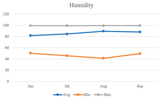As shown in Figure 13, the average humidity values for the respective months were found to be 81.7%, 84.5%, 89.5%, and 88.1%. Humidity exhibited an increasing trend from June to August, followed by a decrease in September, reaching an observed value of 88.1%. The minimum humidity levels were observed to be 50.2%, 45.8%, 41.2%, and 49.4% for the respective months, with August recording the lowest minimum humidity. On the other hand, the maximum humidity levels were observed to be 99.4%, 99.3%, 99.4%, and 99.5% for the respective months, with the maximum values averaging over 99.0%.