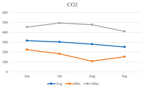 As can be seen in Figure 14, the average values of CO2 data were observed to be 316.6 ppm, 303.4 ppm, 280.4 ppm, and 252.5 ppm, respectively. The average CO2 levels showed a decreasing trend from June to September. The minimum CO2 levels were observed to be 226 ppm, 183 ppm, 109 ppm, and 154 ppm, respectively, with August recording the lowest minimum CO2. The maximum CO2 levels were observed to be 454 ppm, 494 ppm, 478 ppm, and 410 ppm, respectively, with July recording the highest maximum CO2.