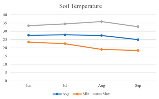 As shown in Figure 15, the average values of soil temperature data were observed to be 27.6 °C, 27.9 °C, 27.4 °C, and 25.0 °C, respectively. Similar to the air temperature, the average soil temperature remained relatively stable at around 27 °C from June to August but decreased to 25.0 °C in September. The minimum soil temperatures were observed to be 23.5 °C, 22.5 °C, 19 °C, and 18.4 °C for the respective months, with September recording the lowest minimum soil temperature. On the other hand, the maximum soil temperatures were observed to be 33.4 °C, 34.5 °C, 35.9 °C, and 32.8 °C, respectively, with August recording the highest maximum soil temperature.