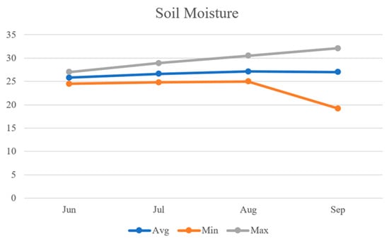 As can be seen in Figure 16, the average values of soil moisture data were observed to be 25.8%, 26.6%, 27.1%, and 27.0% for the respective months. The average soil moisture exhibited an increasing trend from 25.8% in June to 27.1% in August and then remained stable at 27.0% in September. The minimum soil moisture levels were observed to be 24.5%, 24.8%, 25.0%, and 19.2% for the respective months, with September recording the lowest minimum soil moisture. Conversely, the maximum soil moisture levels were observed to be 27.0%, 28.9%, 30.5%, and 32.1%, respectively, with September recording the highest maximum soil moisture.