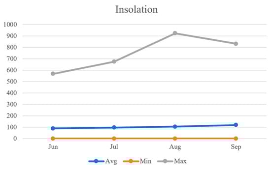As shown in Figure 17, the average values of insolation data were recorded as 89.1 W/, 97.0 W/, 104.3 W/, and 119.2 W/ for respective months. The average insolation displayed a consistent increasing trend from 89.1 W/ in June to 119.2 W/ in September. Throughout the specified months, the minimum insolation levels remained constant at 0 W/. On the other hand, the maximum insolation levels were observed to be 567.5 W/, 674.5 W/, 923.1 W/, and 830.8 W/, respectively, with August recording the highest maximum insolation.