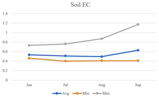 As can be seen in Figure 18, the average values of soil electrical conductivity data were observed to be 0.53 dS/m, 0.51 dS/m, 0.50 dS/m, and 0.63 dS/m, respectively. The average soil EC showed a decreasing trend from 0.53 dS/m in June to 0.50 dS/m in August but experienced a sharp increase to 0.63 dS/m in September. The minimum soil EC levels were observed to be 0.46 dS/m, 0.4 dS/m, 0.41 dS/m, and 0.41 dS/m, respectively, with July recording the lowest minimum soil EC. The maximum soil EC levels were observed to be 0.73 dS/m, 0.76 dS/m, 0.87 dS/m, and 1.17 dS/m, respectively, with September recording the highest maximum soil EC.