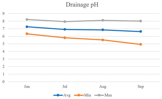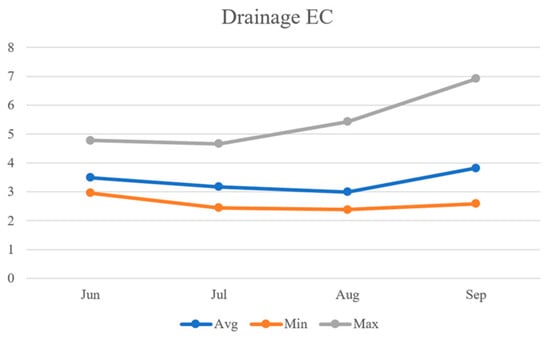 As shown in Figure 19, the average values of drainage EC data were observed to be 3.5 dS/m, 3.2 dS/m, 3.0 dS/m, and 3.8 dS/m, respectively. Similar to the soil EC, the average drainage EC showed a decreasing trend from 3.5 dS/m in June to 3.0 dS/m in August but experienced a sharp increase to 3.8 dS/m in September. The minimum drainage EC levels were observed to be 2.96 dS/m, 2.44 dS/m, 2.38 dS/m, and 2.59 dS/m, respectively, with August recording the lowest minimum drainage EC. The maximum drainage EC levels were observed to be 4.78 dS/m, 4.66 dS/m, 5.43 dS/m, and 6.92 dS/m, respectively, with September recording the highest maximum drainage EC.