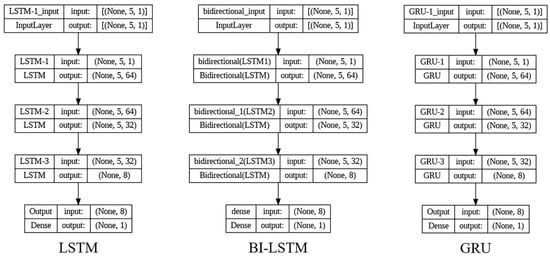 Model architectures for LSTM, BI-LSTM, and GRU.
