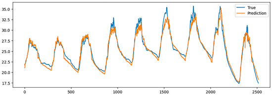 Figure 23, Figure 24, Figure 25 and Figure 26 show the air temperature prediction results using the validation data for the Stacking ensemble, LSTM, BI-LSTM, and GRU models, respectively. The corresponding MSE, MAE, and R-squared values for each model are presented in Table 2.