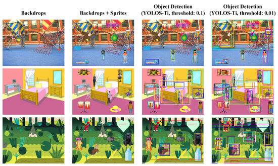 Figure 3 shows the example results of a popular object detection model named YOLOS-Ti [26]. Since this object detection model was pre-trained on ImageNet [27] and fine-tuned on COCO 2017 [10], it rarely has knowledge about our sprite images. Thus, even when the threshold is set very low, to 0.1, as shown in the third-column subfigures of Figure 3, the model seldom finds our sprite images. However, when we further lower the threshold, to 0.01, as shown in the fourth-column subfigures of Figure 3, we can detect almost all of our sprites, albeit with a large number of false positives.