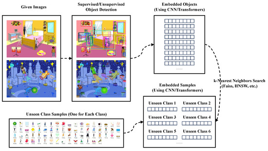 - Finally, we compare these embedded vectors to the vectors of previously embedded unseen class samples using k-nearest-neighbor search algorithms such as Faiss [24] or HNSW [25]. By considering all the k-nearest neighbors, we determine the predicted multiple labels for each object.