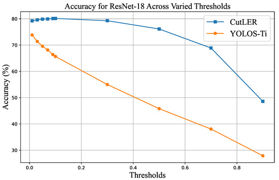 Comparison of accuracy between YOLOS-Ti and CutLER using ResNet-18 across varying thresholds.