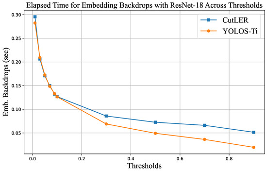 Comparison of elapsed time for embedding backdrops between YOLOS-Ti and CutLER Using ResNet-18 across varying thresholds.