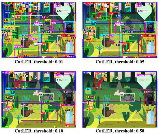 Examples of results obtained with the CutLER model at various threshold levels. Although the model was not trained on our new dataset, it still showed relative success in detecting newly introduced objects.