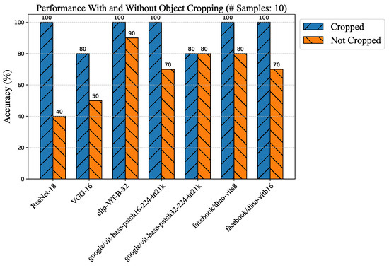 Accuracy comparison using the ten data samples, with and without object cropping.