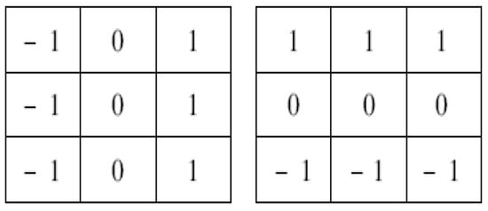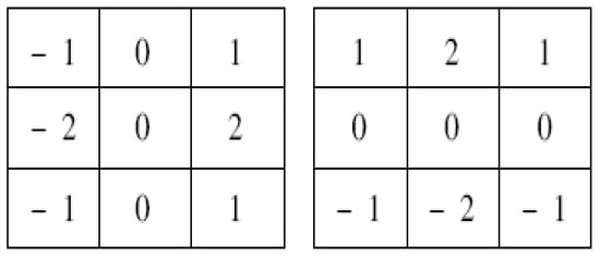 The Sobel operator is a 3 × 3 matrix used to detect horizontal and vertical edges in an image; −1, 0, 1 and −2, 0, 2 denote the numbers in the matrix, which represent the relative position of each pixel point in the image. Figure 7 shows the 2 convolution kernels . The maximum value of the two convolutions is the output value at that point. The result is an edge magnitude image. The edges are picked up according to a certain threshold value. The algorithm has a smoothing effect on noise and can provide more accurate edge orientation information, but the accuracy of edge localization is not high enough.