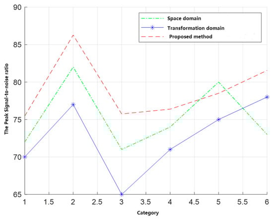 indicates the value of the largest color value among all pixels in the image. The quality of the computed image is evaluated based on the peak signal-to-noise ratio, which is the logarithm of the mean square error between the original image and the processed image relative to . The higher the value of the peak S/N ratio, the lower the distortion of the image and the higher the quality of the image.