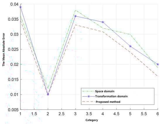 It can be seen from Figure 10, Figure 11 and Figure 12 that through the above different denoising methods for different kinds of defects, nine different sets of evaluation index curves are obtained. Through the curves, it can be learnt that the mean square error of the denoising method proposed in this paper is lower than the other two denoising methods for six different kinds of defects; the peak signal-to-noise ratio is lower than the other two groups for only one kind of defect, and the resistance is higher than the other two denoising methods. Additionally, the mean absolute error is lower than the other two denoising methods for all kinds of defects.