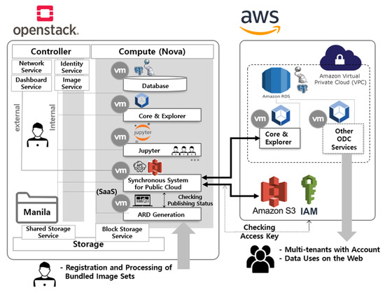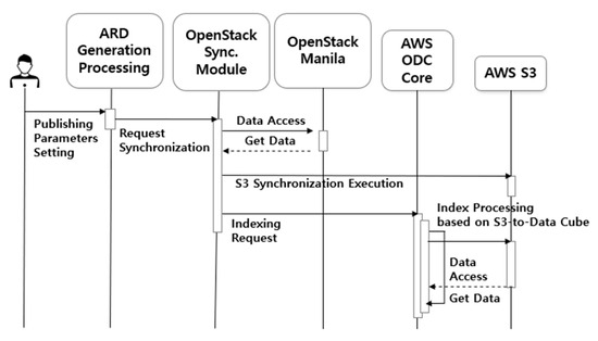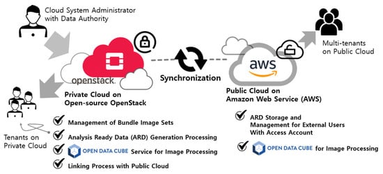 Figure 3 and Figure 4 depict the steps for creating a proposed model using KOMPSAT-3/3A image ARD services. Figure 3 illustrates the process of uploading KOMPSAT data to a private cloud environment and synchronizing it with a public cloud environment. Meanwhile, Figure 4 shows how synchronized data from a private cloud was made available to users through the ODC framework environment in a public cloud.
