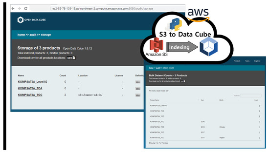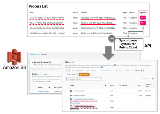 Figure 7 displays the resulting process, where the synchronous system requests indexing from AWS ODC Core and Python S3 to DC on the AWS ODC Core virtual machine performs indexing. Figure 7 also confirms that the two TOC data sets that were set to public in the private cloud are served from the location of S3 (s3://kompsat-public (accessed on 26 June 2023)).