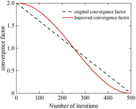 where represents the maximum number of iterations; and represent the initial and final values of the improved convergence factor; is a decreasing exponent between 0 and 1.