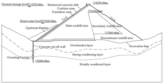 The Dono Hydropower Station is situated on the Baishui River in Sichuan Province, China. It is a project primarily focused on power generation while also considering downstream ecological water utilization for environmental conservation. Figure 4 shows a site photo of the completed Dono Dam. The concrete panel rockfill dam has a crest elevation of 2374.50 m, a maximum dam height of 108.50 m, a crest width of 10 m, and a normal storage level of 2370.00 m. Figure 5 illustrates the internal material composition of the dam.
