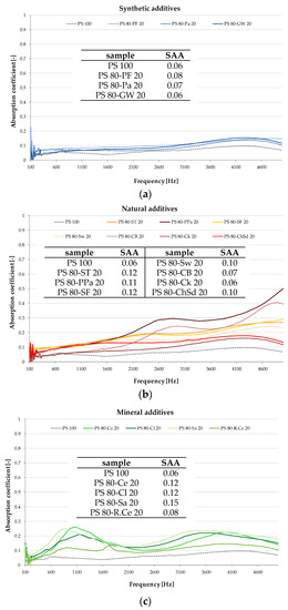 The insertion of mineral additives (Figure 2c) in the composites leads to results comparable to those of natural additives, with a sound absorption peak value of 0.25–0.28 at about 900–1000 Hz, especially with 20% of sand (PS 80-Sa 20, SAA = 0.15).
