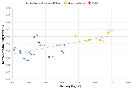Natural additives (dotted blue markers in Figure 4) improve the thermal properties of the plasters, especially when Petiol of Palm (PPa), Stipa Tenacissima (ST), Sisal Fiber (SF), or Cork (CK) are added in the matrix. Higher λ-values of the pure plaster (PS 100) are obtained with the mineral additives and also with paraffin (synthetic), characterized by a density of the same magnitude (ρ = 960 kg/m3). However, glass wool and polyester fiber perform better.