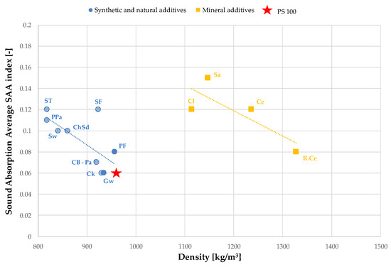 Better performance with respect to synthetic additives was obtained with natural ones, such as Petiol of Palm (PS 80-PPa 20), Sisal Fiber (PS 80-SF 20), and Stipa Tenacissima (PS 80-ST 20), characterized by lower densities (Figure 2b). In terms of SAA, values in the 0.10–0.15 range were obtained, double or more with respect to the value of the reference sample (0.06).