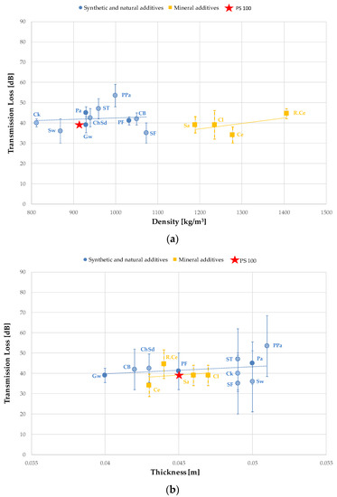 Transmission loss of the plasters with additives: influence of the density (a) and the thickness (b).