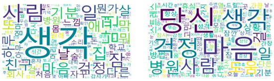 Wordcloud of ‘utterance (2차) ’column and ‘response (공감)’ column. In the picture on the left, words such as “Thinking”, “People”, “Work”, “Sleep”, “Friend”, “Worried”, “Mind”, “Feeling”, “Home”, “Day”, “My husband”, “Other”, “First time”, “Mom”, “Drinking” are drawn in word cloud in the order of the letter size. In the picture on the right, words such as “You”, “Heart”, “Worried”, “Thinking”, “People”, “Hospital”, “Work”, “Help”, “Concern”, “Feeling”, “How”, “Everything”, “A moment”, “Situation”, and “Stress” are drawn in word cloud.