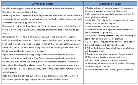 Data from the r/depression subreddit channel were extracted from Reddit, a mega-social community site in the United States. In this paper, 30,000 posts and comment data from 2010 to 2016 were randomly extracted. In the “depression” subreddit, any violation of the notice and detailed rules will be deleted regardless of the number of recommendations. The notice and detailed rules are shown in Figure 4.
