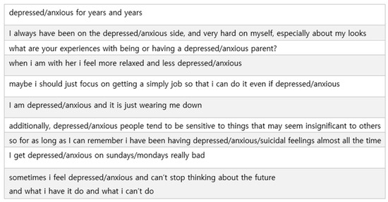 In the case of wellness counseling data, the “utterance” column, which involves counselors’ utterances, and the “response” column, which involves counselors’ responses, were used. After that, the missing value was deleted. In r/depression data, there is data in which two adjectives are bound by “/”. If “/” is contained, there is no clear analysis, so preprocessing is required. The way we came up with it was deletion. Thus, we deleted sentences containing adjectives on either side of a “/”, such as “depressed/anxious”. An example of a sentence is shown in Figure 5.