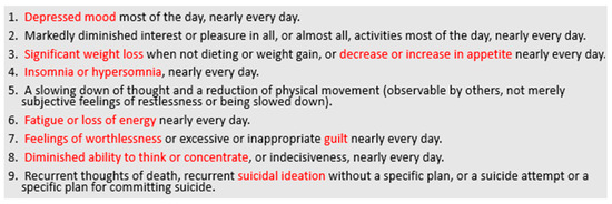DSM-5 diagnosis criteria for depressive disorder. Red letters are the key content in each criterion.