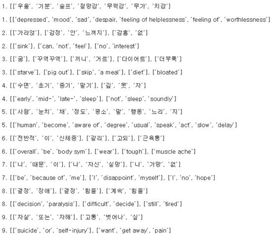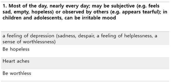 A word dictionary was created based on the nine DSM-5 diagnostic criteria for depressive disorder. Medical staff working in the Department of Mental Health Medicine collected expressions for each of the nine depressive disorder criteria and generated a dictionary, as shown in Figure 7.