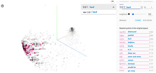 After that, similar words were visualized using TensorBoard Embedding Projector (www.projector.tensorflow.org, accessed on 20 March 2023), and secondary selection was performed. Figure 15 shows the results of visualizing words similar to ‘tough’.