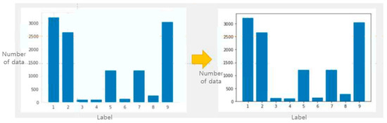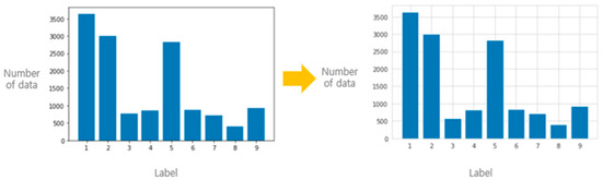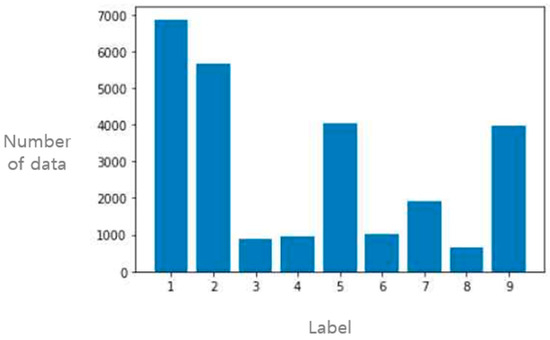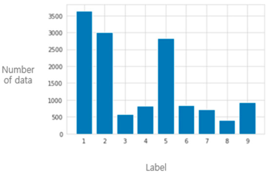 Classified data sets were labeled according to the DSM-5 depression disorder diagnostic criteria. For example, if the word dictionary for the third diagnostic criterion, “loss or gain weight without diet, loss or increase of appetite almost every day”, contained a “pig” in the counseling dataset sentence, the sentence was given a label of number 3, which means the third diagnostic criterion. Figure 16 shows the results of labeling wellness consultation data according to the nine diagnostic criteria and visualizing the frequency.