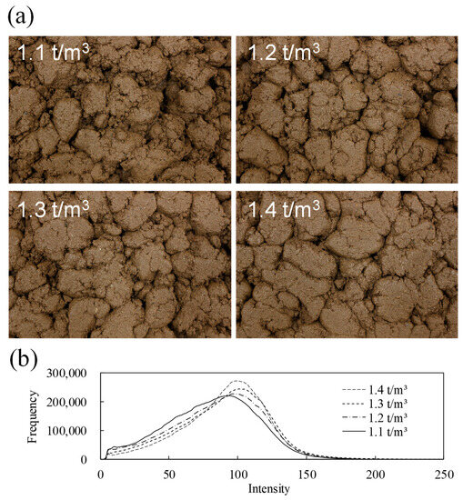 The soil texture is SiL and the water content is 25%. Soil solids are visible in Figure 3a, and voids, which are dark spaces between soil solids, are also present. Under the condition of low , numerous voids are distributed, and as the increases, the distribution of the voids decreases. Figure 3b shows the histogram after converting the color image of Figure 3a to grayscale. The histogram is bell shaped, skewed to the right with one peak. For the intensity of the digital images and its histogram, 0 means black and 255 means white. As the increases, the frequency of the low intensity decreases and the frequency of the high intensity increases in the histogram. The average intensities of the histogram were 81.4, 85.5, 89.7, and 91.3, respectively. Comparing Figure 3a,b, the voids were distributed at a low intensity and the soil solid was distributed at a high intensity.