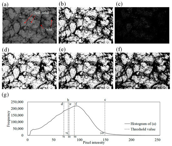 Figure 4a is an image with a of 1.1 t/m3 in Figure 3a converted to grayscale. Figure 4b–f are threshold binary images, which are easier to distinguish between soil solids and voids than in the original grayscale image. Figure 4b,c show thresholding results using the Otsu method and Triangle method, respectively. Because both methods are automatic thresholding, the threshold value was automatically determined by the algorithm. In the case of the Otsu method, the soil solid and voids were well distinguished; however, it was difficult to distinguish them from the results of the Triangle method because the threshold value selected by the Triangle method was 149, which is far from the median value of the histogram. As a result, most of the pixels were classified as a void. Figure 4d–f show the results of simple thresholding with threshold values of 70, 80, and 90, respectively. Increasing the threshold value from 70 to 90 appears to noticeably increase the area of the voids displayed in black pixels on the image. Specifically, as the threshold value increases, and increase. Therefore, the accuracy of the density prediction will vary according to the threshold value.